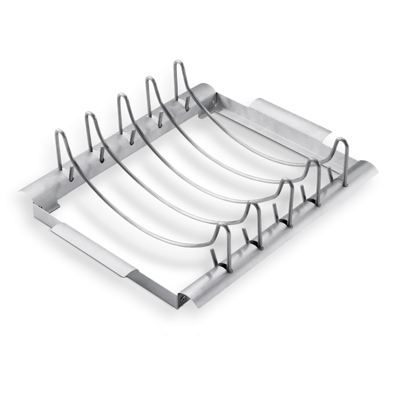 Mals vlees dat zo van het bot valt. Verrukkelijke braadstukken met een heerlijke smaak door de rook onder het deksel van de barbecue. Het twee-in-een ontwerp van de Deluxe vleeshouder is geschikt voor meerdere spareribs zodat u meer ruimte op uw grillrooster krijgt. Het kan ook worden gebruikt als een stevige korf voor sappige braadstukken.