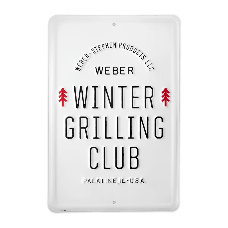 Dit Limited Edition Weber® Winter Grilling Club metalen bord hoort aan de muur van iedereen die blijft barbecueën, ondanks de dalende temperaturen. Het bord met zijn strakke uitstraling, opvallende letters en winterse afbeelding past perfect in elke hobbyruimte, garage of achtertuin.